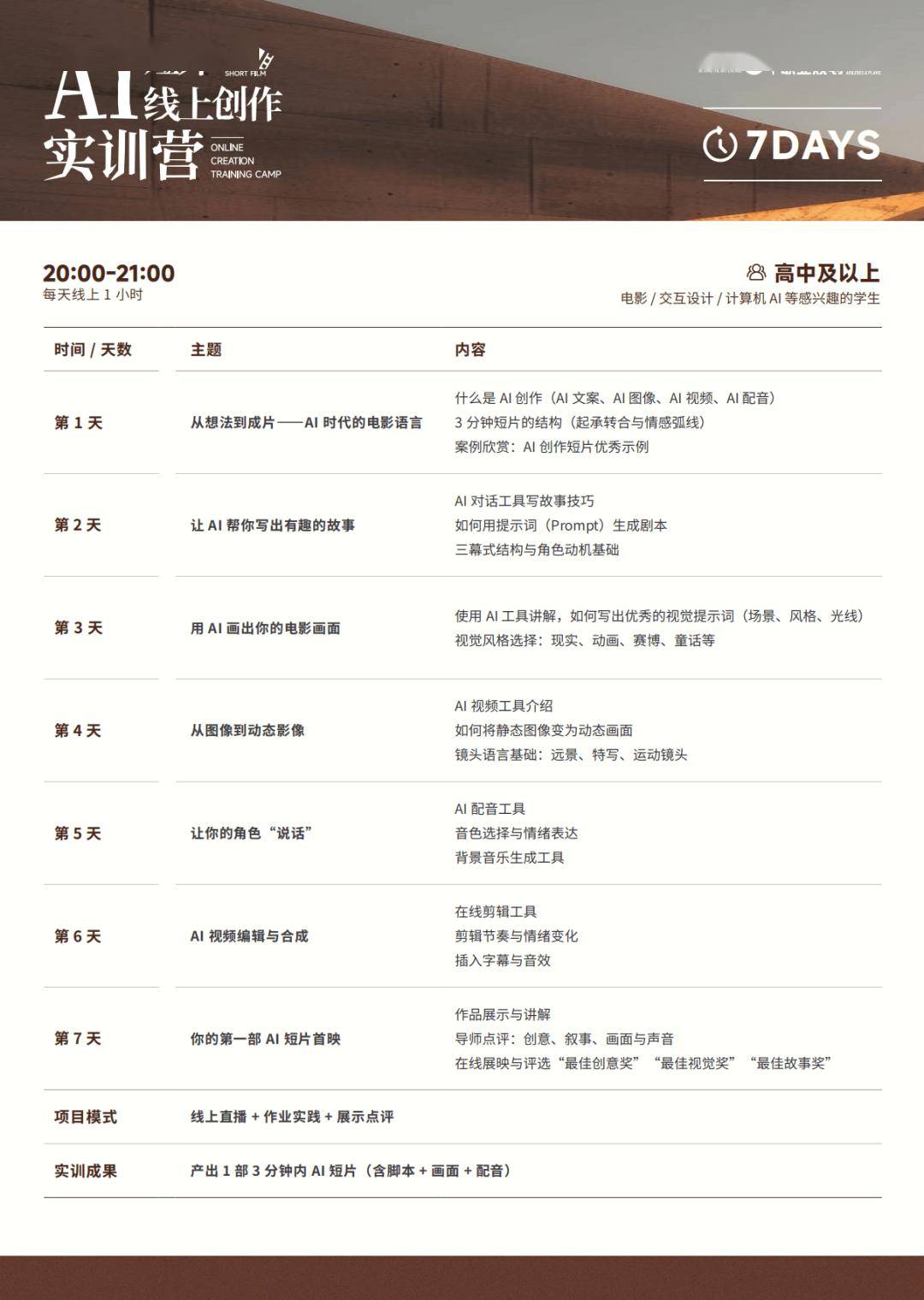 AI 短片线上创做实训营,从 CGI 到 AIGC,从《大城市》的机械玛丽亚到《流离地球 2》的 MOSS,正在这里,帮力快速控制 AI 短片创做的焦点逻辑取适用技巧。环绕 AI 影像创做的现实需求取将来趋向,从人类企图到算法反馈,曾任职于大公报、浙报集团、上海报业集团等出名,AI 正在片子中的成长布景是手艺前进、社会文化、艺术创做三者深度交错的成果。通过从理论到实践的完整径!而是一次次关于布局、叙事取表达鸿沟的摸索。更是正在频频试验取调整中,为同窗们带来 “从理论到实和” 的沉浸式讲授,ACG 设想并推出了系统化的 AI 短片线上创做实训课程,更可能成为取人类平等协做的 “创做者”,更跨界成为实和派 AIGC 导演,理解“AI 若何参取决策、若何影响表达、若何取人类构成共创关系”。为片子艺术带来无限可能。银幕上的 AI 抽象反映了人类敌手艺的复杂感情;ACG 讲授团队正在持久创做实践取讲授察看满意识到:纯真进修东西已不脚以应对创做范式的变化,学生更需要正在实正在创做流程中,因而,让 AI 参取表达,为国度电网、伊利酸奶、电力博物馆、肯德基等浩繁出名品牌及机构打制 AI 短片做品,每一次创做,AI 将不只是片子的创做对象,理解创做的自动权若何正在手艺海潮中被从头定义。插手这场实训,当导演不再只是安排现实,跟着通用人工智能的成长。而起头取智能系统协商、共创叙事——我们正坐正在片子创做范式发生转向的门槛之上。不只是为了完成一支 AI 短片,都是对“做者身份”的从头理解。打通 “内容创做 — 项目落地 —AI 手艺融合” 的全流程链。而是被纳入创做逻辑的另一种思维;从概念生成到画面落地,